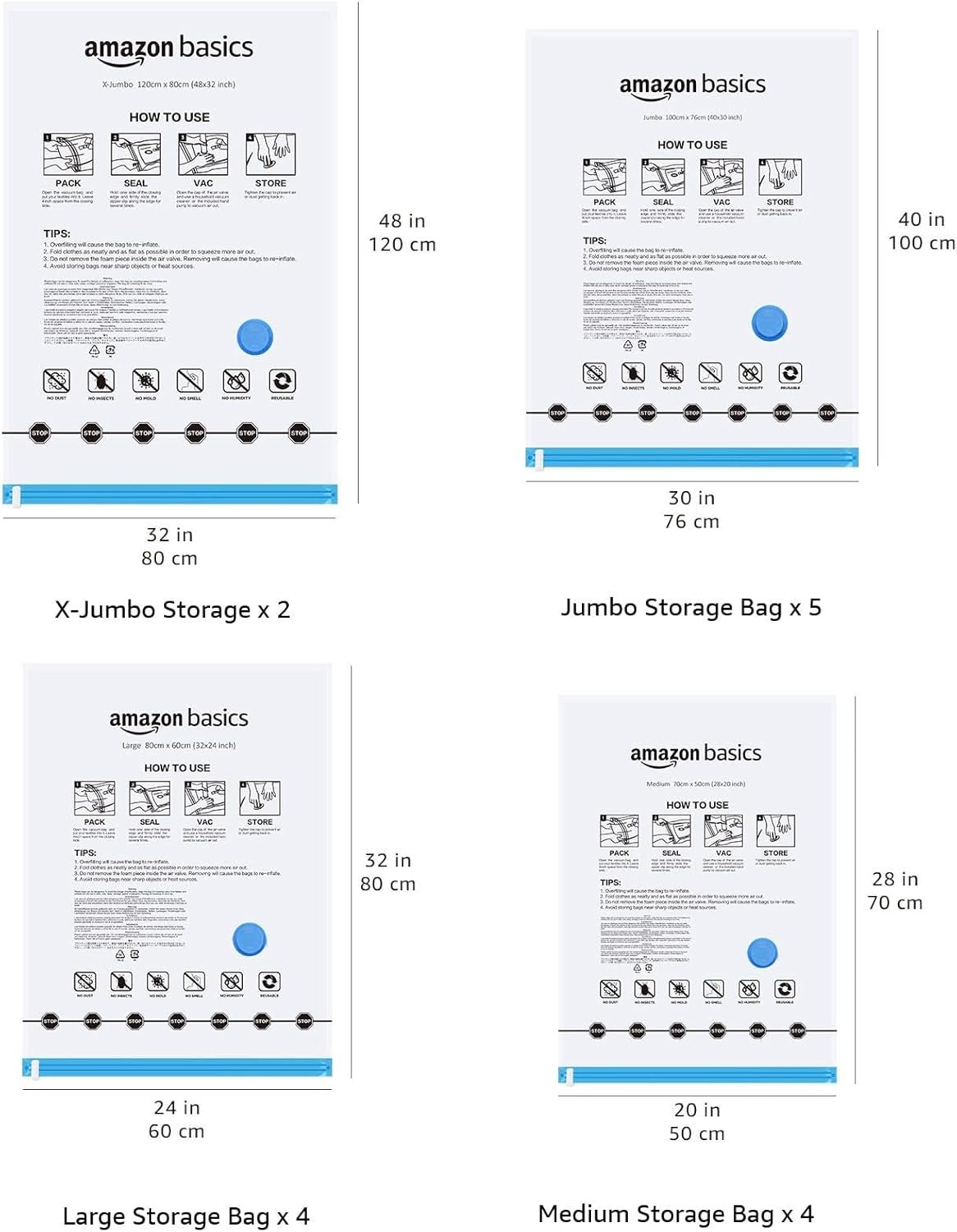 A: You get 2 X-Jumbo (48 x 32”), 5 Jumbo (40 x 30”), 4 Large (32 x 24”), and 4 Medium (28 x 20”) bags—plus a convenient hand pump for use at home or while traveling. See full specs on Amazon Basics’ official storage page.